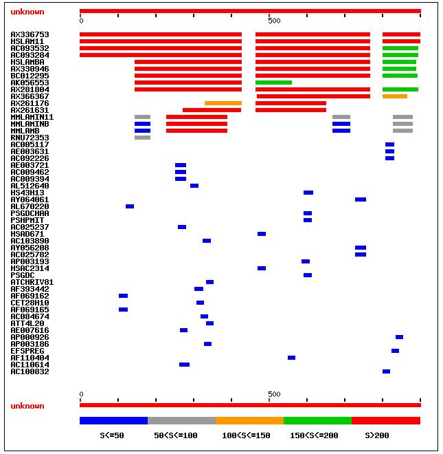 Īn aceasta imagine, linia roşie reprezintă secvenţa introdusa. Această linie are īn imediata vecinătate o scală reprezentānd numărul de nucleotide. Sub scală sunt date numeroase linii de diferite lungimi şi culori fiecare reprezentānd o secvenţă din baza de date. Fiecare dintre ele ar trebui examinată īn parte. Dacă secvenţa există īn baza de date, linia imediat următoare ar trebui să aibă aceeasi lungime reprezentānd o identificare completă a secvenţei introduse. Dacă toate liniile sunt mai scurte ca īn exemplul nostru, atunci probabil că secvenţa introdusă nu este īn baza de date şi lprima linie după scală reprezintă secvenţa cu care secvenţa are cel mai lung aliniament. Toate liniile care urmează sunt mult mai scurte, Aceasta ilustrează īntr-un mod grafic că celelalte au un grad mai redus de homologie cu secvenţa introdusă.