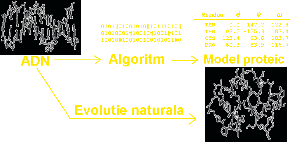 Procesul de evoluţie a produs secvenţe ADN care codifică proteine cu funcţii foarte specifice. Este posibilă prezicerea structurii tridimensionale a unei proteine utilizānd algoritmi care au fost deduşi din cunoştiinţele noastre de fizică, chimie şi foarte important, din analiza altor proteine cu secvenţe de aminoacizi similare. Diagrama din figura 3 prezintă procesul prin care secvenţele de ADN sunt folosite la modelarea structurii proteinelor. |