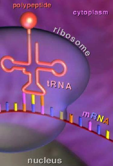ce apar în Traducerea lui m-ARN în limbaj proteic este guvernată de codul genetic, care a fost pusa în evidenţă în 1964. Există 43 = 64 tripleţi de baze diferiţi, numiţi codoni. Şaizeci dintre ei codează câte un amionoacid. Unul, AUG, codează şi un aminoacid dar este în acelaşi timp şi un codon de start semnalând începutul translaţiei (traducerii). Ceilalţi trei râmaşi sunt codoni de stop ce semnalează sfârşitul tranlaţiei. Codul este degenerat deoarece un aminoacid poate fi specificat de câţiva codoni diferiţi. Astfel nu există o secvenţă de nucleotide unică pentru o proteină dată. Codonii apar ca tripleţi consecutivi nesuprapuşi de-a lungul m-RNA. Translatia are loc în ribozomi: structuri submicroscopice din citoplasmă. În timpul translatiei, ribozomul se mişcă de-a lungul moleculei m_ARN adaugând câte un amino acid la lanţul polipeptidic pentru fiecare codon “citit”. Există o moleculă t-ARN specifică fiecărui tip de codon. Legăturile între nucleotidele t-ARN îi dau acestuia un aspect oarecum asemănător cu o frunză de trifoi (cloverleaf) care are o de recunoaştere a codonului, numită anticodon, iar la unul dintre capetele lanţului se va forma aminoacidul corespunzător. Translaţia începe cu codonul de start AUG şi succesivi t-ARN transportă succesivi aminoacizi la locul de translaţie, unde fiecare este adăugat la lanţul polipeptidic. Translaţia se termină când este atins un codon de stop în m-ARN. Câţiva ribozomi pot traduce m-ARN simultan. În acest mod, mai multe polipeptide identice pot fi citite din aceeaşi secvenţă m-ARN într-un timp scurt. Translaţia are loc de la capătul 5’ la capătul 3’ al m-RNA şi de la capătul amino la capătul carboxil al polipeptidei. Vezi aici o exemplificare in Flash! |