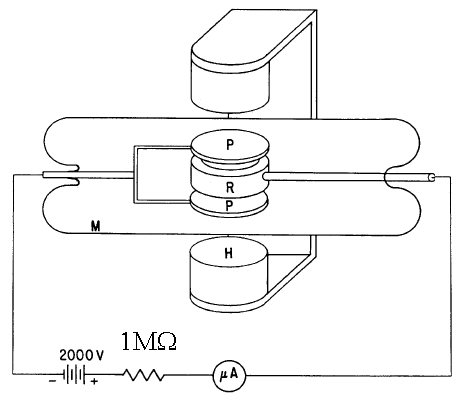 P – catozi, H – poli magnetici, R – Anodul si M – balonul de sticla vidat.