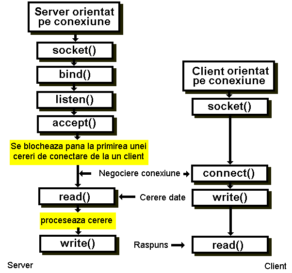 Figura urmatoare prezinta apelurile tipice pentru socketuri pe care o aplicatie le poate folosi cu un protocol orientat pe conexiune.