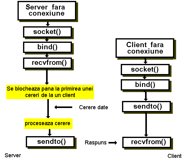 Figura urmatoare ilustreaza secventa tipica de apelurile pentru socketuri utilizate la protocoale fara conexiune.