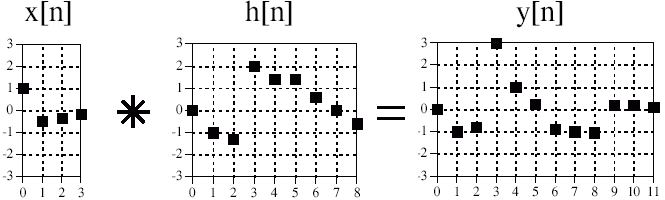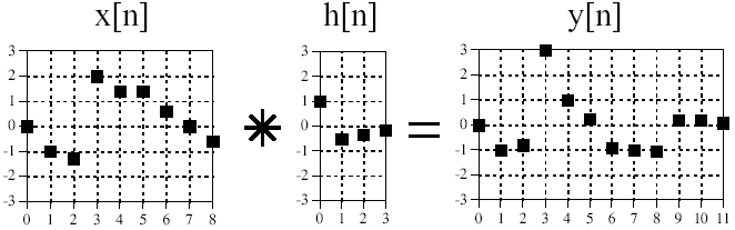 Cu alte cuvinte semnalul de intrare convolutat cu semnalul de raspuns la impuls reprezinta semnalul de iesire. De regula operatia de convolutie este notata folosind caracterul steluta (*) care, din nefericire, in toate limbajele de programare, desemneaza operatia de inmultire.